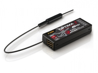 Sedmikanálový 2,4 GHz přijímač s AFHSS systémem Hitec s přenosem telemetrie, plným dosahem a zvýšeným rozsahem napájecího napětí (4-5 Ni-xx, 2s Li-poly). Přijímač je určem pro všeobecné použití v běžných modelech všech kategorií; díky malým rozměrům, nízké hmotnosti a konektorům zasouvaným v podélné ose je vhodný i pro modely s velmi štíhlým trupem. Použití AFHSS přenosové technologie přináší vysokou odolnost vůči rušení a možnost nastavení nouzových výchylek (fail-safe) pro případ výpadku nebo silného rušení signálu vysílače.